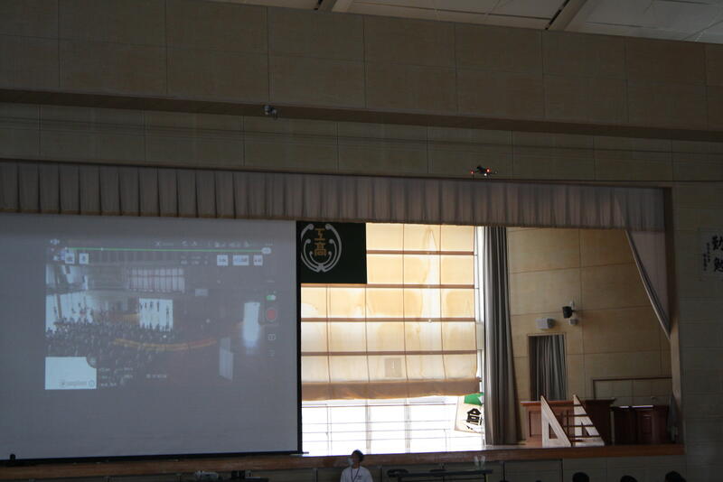 贈呈式後、本校体育館で全校生徒対象に「ドローン基礎講座」を開催しました。初めて間近でドローンを見る生徒も多くいましたが、実演を交えて、分かりやすくドローンの活用法等についてお話しいただきました。