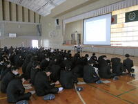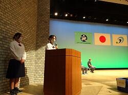 ホールでは防災についての講演会や書道や絵画などの表彰式が行われました。2名の女子生徒が緊張しながらも福祉まつりの司会進行を努めてくれました。