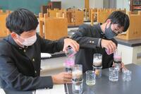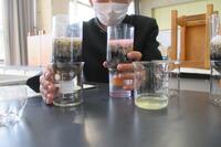 ペットボトルに砂などを層になるように詰め、各自が学校周辺で得ることの出来る水を集めてろ過しました。ろ過の前後でpH測定と硝酸銀水溶液を用いて塩素が含まれているか調べました。