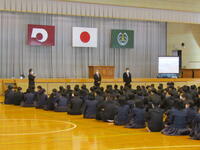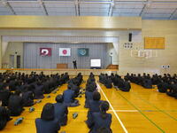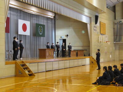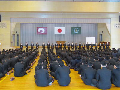 【新任式】10名の先生方をお迎えして、生徒会長より歓迎の挨拶がありました。新しく着任されました先生方、よろしくお願いします。