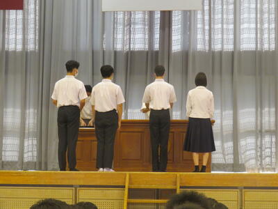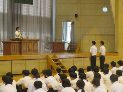 3年生7名(機械科3名、電気科1名、土木科3名)が、7月~8月にかけて実施された天草宝島起業塾高校生コースに参加し、機械科・電気科の合同チームの発表において、「最優秀賞」を受賞しましたので、その表彰式が行われました。校長先生より、昨年、一昨年と「優秀賞」、今年度「最優秀賞」と参加生徒の活躍を紹介いただき、賞状・記念品が手渡されました。