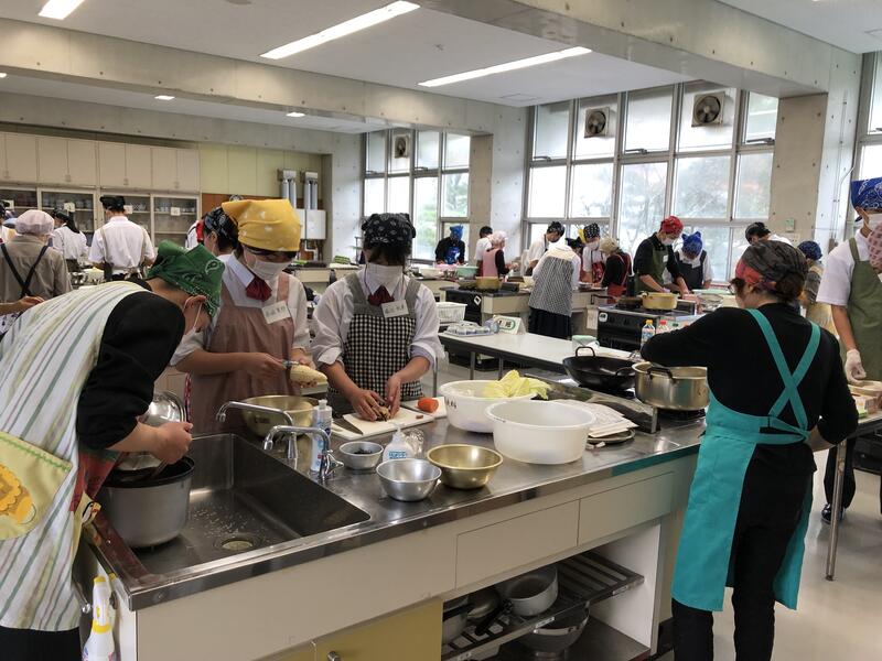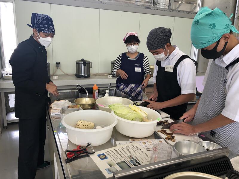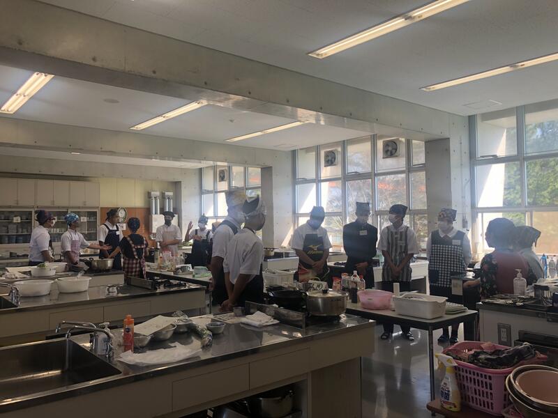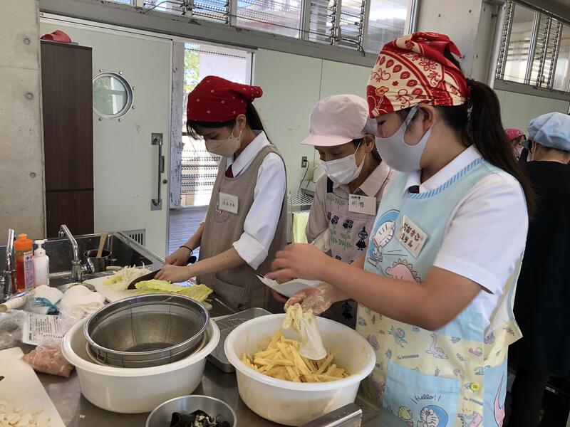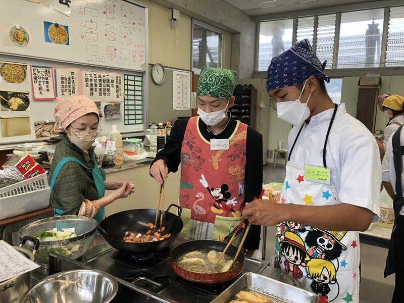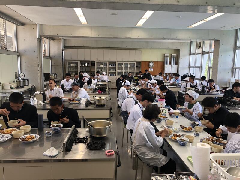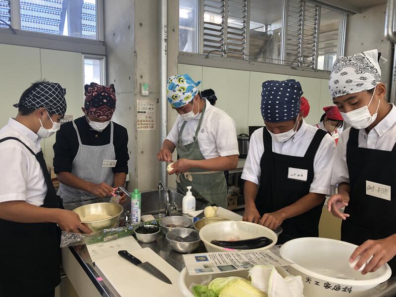 令和4年度10月11日(火)~17日(月)の5日間に渡り、2年生を対象とした郷土料理講習会が天草工業高校の調理室で開かれました。天草の特産品を取り入れた料理を作ることにより、「食」をはじめとする郷土の生活文化について学ぶとともに、天草市地域婦人会の方々との交流を図り、郷土の良さを見直す機会を目的としました。献立は「魚の蒲焼き丼」「押し包丁」「がね揚げ」「タコのぶた和え」の4種を作りました。生徒たちは夢中になって料理を作っており、天草市地域婦人会の方々たちと、コミュニケーションを図りながら料理をしていました。その後は自分たちで作った料理を美味しそうに食べていました。天草市地域婦人会の皆様方、生徒達のために貴重な機会を設けて頂きありがとうございました。