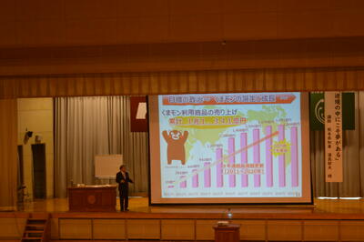 自身の生い立ちから知事に就任するまでの話をもとに、「人生の可能性は無限大」「夢に向かって一歩踏み出す」など熱いメッセージをいただきました。「知事として一番大切にしていることは」「熊本のいいところは」という生徒からの質問には、半導体産業の現状などに触れながら知事の信念について語られました。最後にはくまモンも登場し、講演会をさらに盛り上げてくれました。