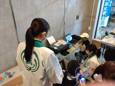 今回のワークショップは、機械科:缶バッヂ製作、電気科:光るうちわ製作、土木科:木工椅子製作、情報技術科:オリジナルゲーム体験を実施しました。10時の開始と同時に多くの方々に来場していただき、盛況のうちに終えることができました。荒木教頭先生もACN(天草ケーブルネットワーク)よりインタビューを受けられました。