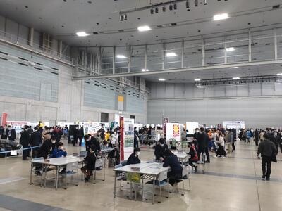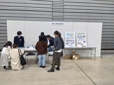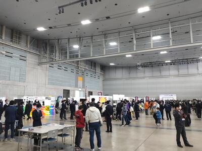 本日、グランメッセ熊本で開催された「第1回熊本スーパーハイスクール(KSH)全体発表会~県立高校学びの祭典~」に土木科2年生3名が参加してきました。この発表会は、県内各高校の生徒が一堂に会して学校紹介(展示・販売・体験コーナー)をはじめ、取り組まれている探究活動などを発表する場で、多くの来場者とともに賑わいました。本校は県立高校OneTeamプロジェクト事業で取り組んでいる「街なか高校生派出所」についての展示・発表とものづくり体験コーナーを設けPRしてきました。