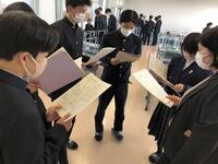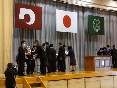 本日、令和4年度第58回卒業証書授与式が行われました。新型コロナウイルスに関する規制も緩和されて、来賓、保護者の方々に迎えられ195名の卒業生が卒業証書を手にしました。