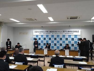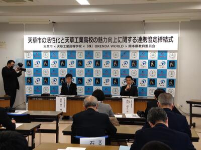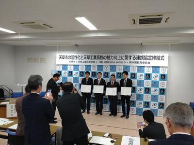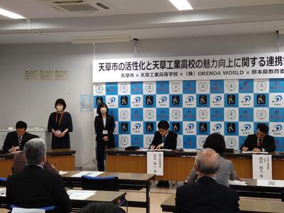 本日、本校会議室にて「天草市の活性化と天草工業高校の魅力向上に関する連携協定締結式」が行われました。この連携協定は「天草市」、「天草工業高校」、「(株)ORENDA WORLD」、「熊本県教育委員会」によるものです。
