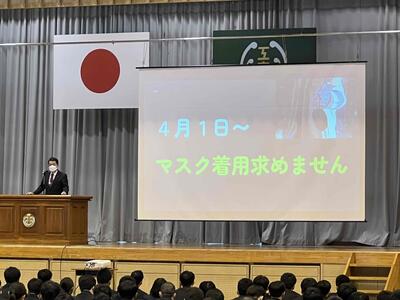 令和4年度修了式が行われました。校長先生より、本校沿道沿いにある「陽光サクラ」の満開、中庭にある「ソメイヨシノ」が蕾から開花に向かうとともに、春が訪れていることが実感できることから、「新年度へ向けてのスタート」と題して主に以下のお話がありました。