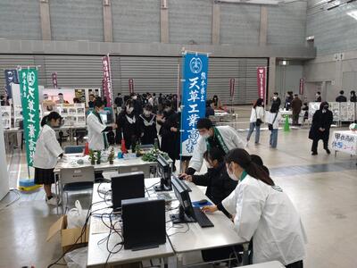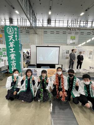 本日、グランメッセ熊本で開催された第2回熊本スーパーハイスクール(KSH)全体発表会「県立高校 学びの祭典」に情報技術科2年生6名が参加しました。この発表会は県内すべての県立学校で探究活動に取り組む生徒が一堂に会して、学校紹介(展示・販売・体験コーナー)をはじめ、それぞれが取り組んだ探究活動の成果を発表する場です。本校は令和6年度入学生よりスタートする情報技術科の新しい学び「CG系列」の紹介とオリジナルゲームおよび季節感あふれるものづくり体験コーナーを設け学校のPRをしてきました。