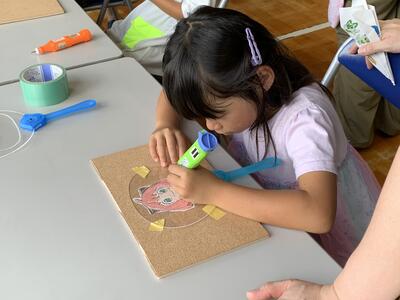 機械科では缶バッヂ製作、電気科では光るうちわ制作、土木科ではペン立て製作、情報技術科ではペーパークラフト(紙飛行機・紙でつくる竹とんぼ)をそれぞれ準備しました。元気いっぱいで製作してくれたので、こちらも元気をもらえました。