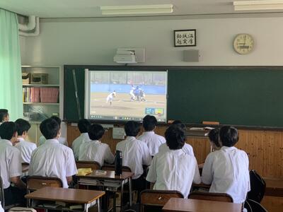 7月17日(水)本校野球部が3回戦までコマを進めたことで、この感動を全生徒に伝えたいという熱い思いから、試合のある9時から各教室で高校野球観戦を行いました。野球観戦は大変盛り上がり、選手の一挙手一投足により拍手や歓声が上がっていました。
