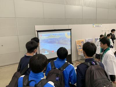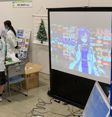 本校からは、学校PR用パネル展示やオリジナルゲーム、CG系列の動画などを流したり、ワークショップとして缶バッヂ作成とミニクリスマスツリーの作成を行いました。とても大盛況で、ワークショップは2種類とも完売してしまいました。