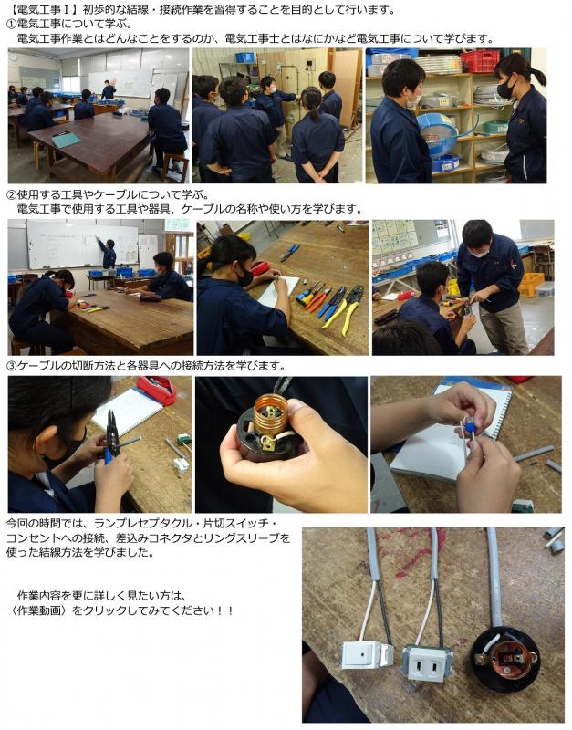 本日紹介する項目は「電気工事Ⅰ」です。1年生の生徒たちは初めて電気工事作業を学びました。
