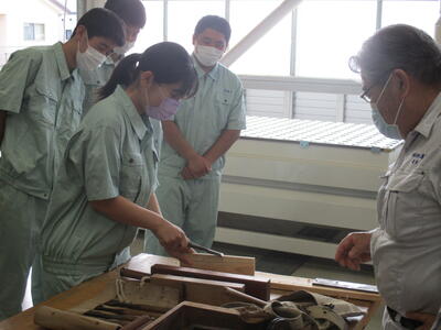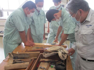 土木科の3年生(6人)が伝統技術の継承、若手技術者の育成について、外部講師(有限会社 原田工務店:代表取締役 原田 良 氏)による講義、実技指導を実施していただきました。本日は2回目で、工具の手入れおよび工具の使用について学習しました。次回の講義、指導は7月7日(木)に実施していただきます。