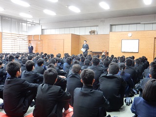 本日は、3年生は体育館、2年生は武道場、1年生は柔道場でと各学年とも学年集会からスタートしました。1年生の学年集会はオリエンテーションということで、教頭講話の後は教務部や保健体育部などの各部から学校の仕組み等についての説明が行われています。この後は校歌の練習も予定されています。まだまだ話しが続きますので、少し疲れてきているところでしょうか?(^^;)