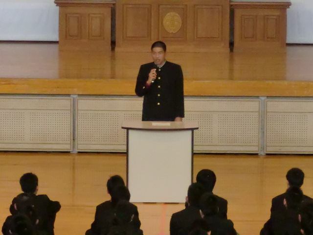 全校集会後は結団式が行われました。校長先生からの話の後、体育委員長の堤内君の話と続き、最後に各団の団長・副団長の挨拶が行われました。各団から”優勝を目指して頑張る!”という言葉を聞くことができました。