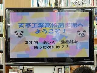 1年生を対象とした図書館オリエンテーションを行いました。本日は最終日で、5限目に電気科1年生へのオリエンテーションを行いました。4月23日が「こども読書の日」ということで、司書の田中先生から絵本の読み聞かせからスタートしました。