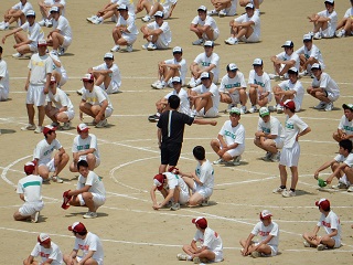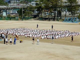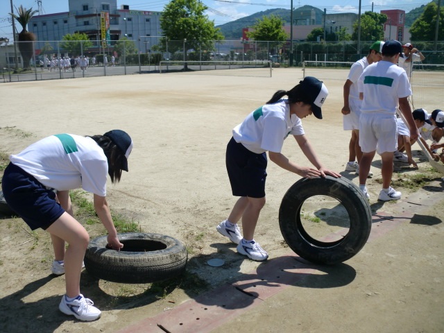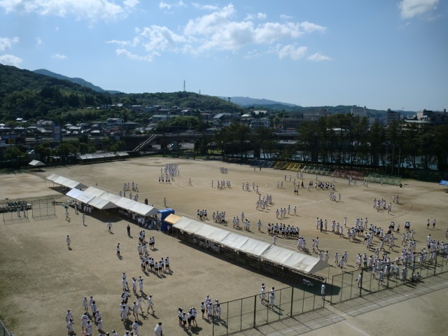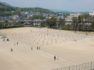 今年度初めて体育大会の練習がグラウンドで行われています。ずっと雨ばかりでしたので、外でできて一安心といったところです。現在は男子の組み体操とエッサッサの位置取りが行われています。女子は体育館で御神楽とダンスの位置取りです。