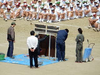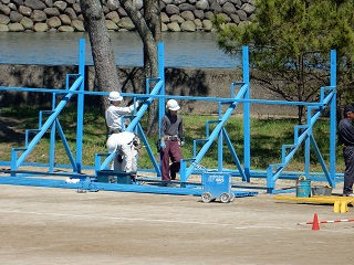 昨年度までは団席運搬後は3年生が団席を組み立てていましたが、今年度からは業者の方にお願いすることになり、現在組立を行っていただいています。先生方も一緒に作業されています。生徒達は体育大会の練習を行っています。