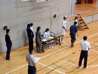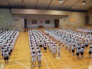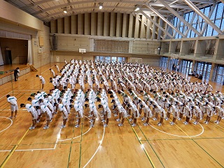 体育大会の練習が体育館で行われています。現在は開閉会式の練習を行っているところです。限られたスペースでできることをやっている状況です。この後は各係の役割確認や招集の確認等が予定されています。