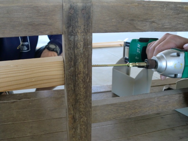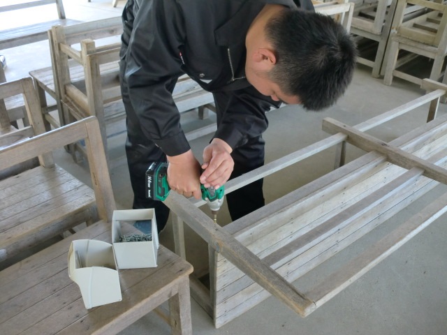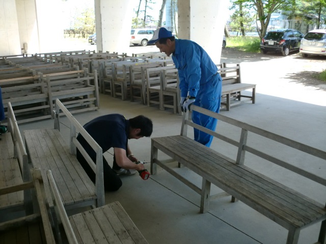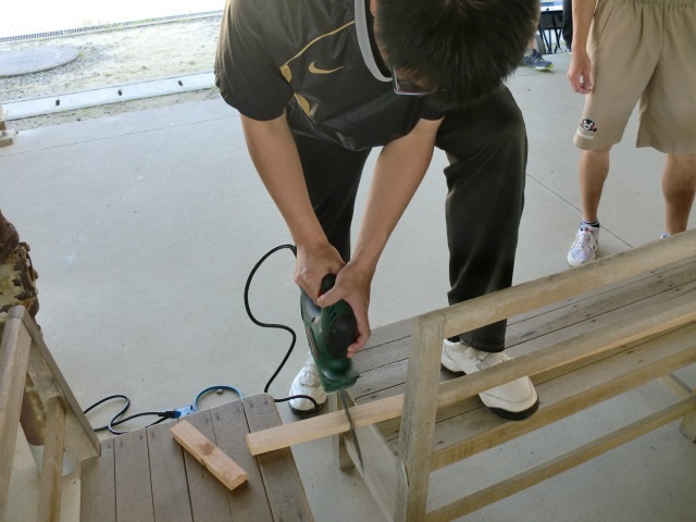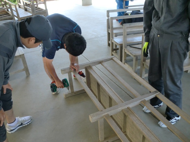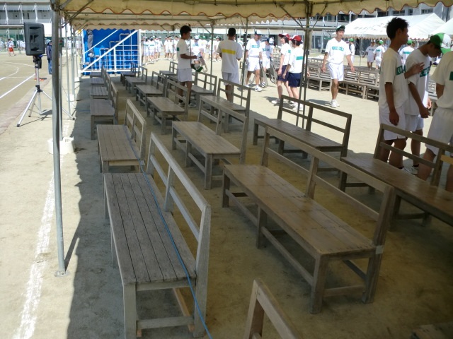 体育大会で使用する木製ベンチの補修を行いました。約50年間という長い間使われてきたベンチですので、痛みが激しいものもあります。ベンチの補修は毎年の恒例行事となっていますが、少しでも長く使えるように木ネジを入れたり、新しい木と取り替えたりしています。このベンチは保護者席などで使われます。