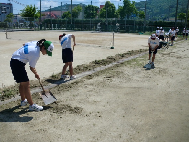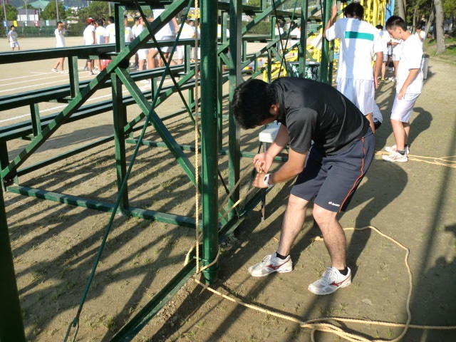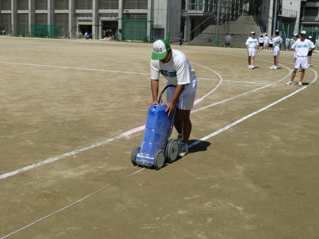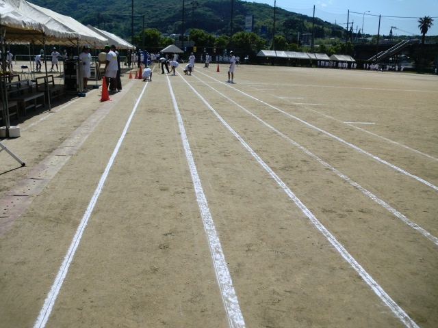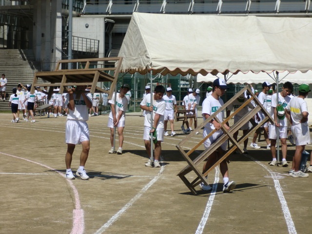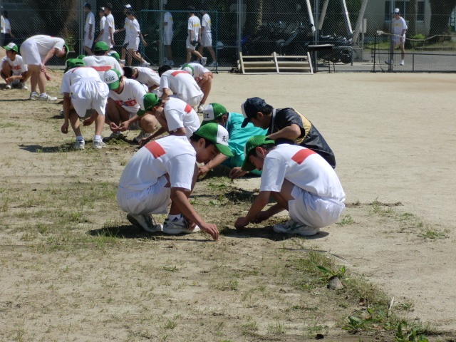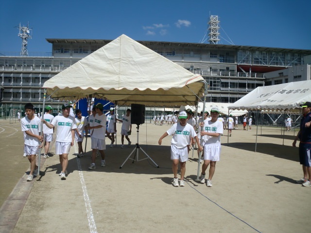 体育大会の準備を行いました。テントを組み立てて運んだり、草取り、ラインを引き、イス並べ、放送準備、得点板をつけ等と各役割をみんなで担当し、ほぼ準備を終える事ができました。現在は各競技練習を行っています。