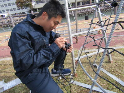 接地抵抗地を計測しています。 無停電工法の練習をしています。 電源車の操作を習っています。
