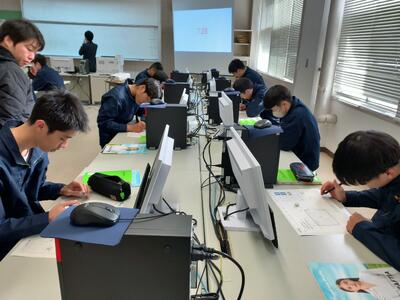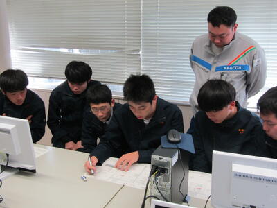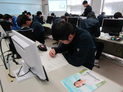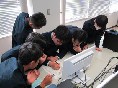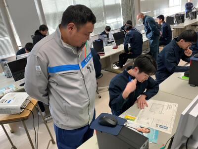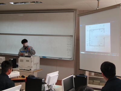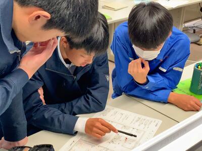 生徒たちは、第二種電気工事士の学習をするときに、図面や図記号の読み方や定格容量などの計算を行いますが、今回は「図面を作る」内容となりました。自分たちの知識を使いながら、いつもとは違う学習をすることはとても新鮮かつ楽しんで授業を受けていました。