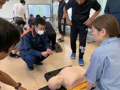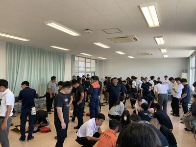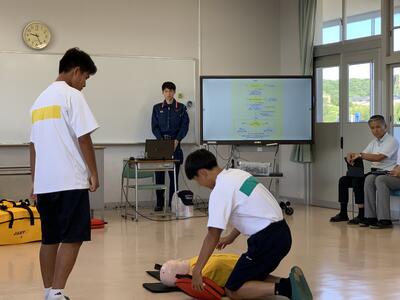 連日の猛暑により、学校教育活動及び部活動中おける熱中症等の命に係わる事故のリスクが増加しています。そのため本校では、応急手当の重要性を知り、心肺蘇生法やAEDの取り扱いなどについて学ぶことで、学校の内外問わず、いつ身近に起きるかわからない緊急時態に備えることを目的とし、天草広域連合広域本部から3名の講師の方々をお招きして標記の講習会を開催しました。。
