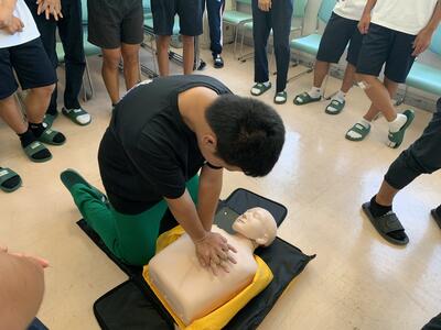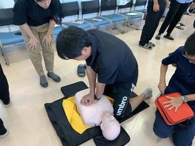 講義後は、グループに分かれて胸部圧迫とAED使用の練習を行いました。思っていた以上に胸部圧迫をするには体力を必要とすることが分かりました。当日は気温も高かったこともあり、全身に汗をかきながら真剣に取り組む生徒の姿も見受けられました。