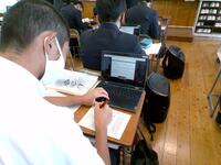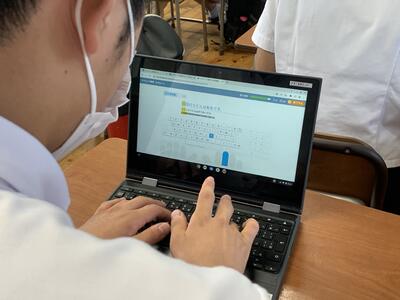 資格取得に向けて、一人一台の端末を活用して、問題を解いていました。生徒たちは、それぞれの学びの進度に応じて取り組む事ができています。また、問題を解き終えると、自己採点を行い現段階の理解度を確認することができました。