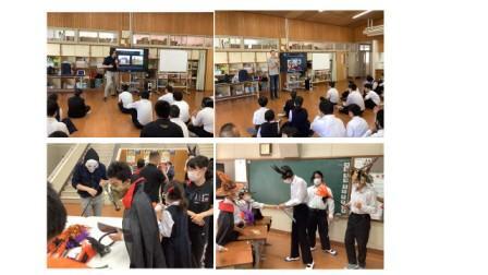 10月31日、今年も外国語活動において「ハロウィン」の学習をしました。魔法使いやお化けに仮装した2人のALTの先生と一緒に学習しました。ちょっと怖いけど、勇気を出して「トリック・オア・トリート!」と呼びかける子ども達。特別なシールをもらい、楽しいハロウィンを過ごし外国の文化に触れることができました。