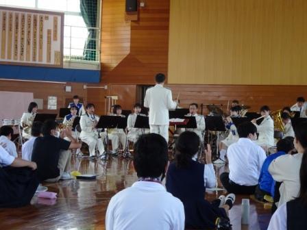 小・中・高重複校舎で警察音楽隊をお招きして「音楽コンサート」がありました。曲の合間に荒尾警察署の方から交通安全教室も実施していただきました。