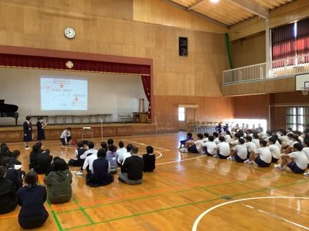 両校の生徒による学校紹介があり、お互いについて知ることができました。その後、荒尾第四中学校の3年生が準備してくれたゲームを行い、笑顔と歓声につつまれ楽しい時間を過ごすことができました。最後は、3年生の全体合唱があり、本校生徒は熱心に聴き入っていました。