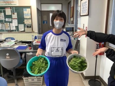 11月20日に中学部3年生が育てているほうれん草を間引きしました。たくさんの芽が出て、ぐんぐん成長しました。この間引き菜は、翌21日の給食のコーンスープに入れてもらい、おいしくいただきました。