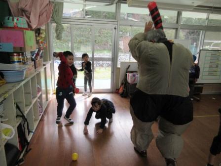 12月13日の英語では、イラストに色をぬったり、おり紙を折ってオーナメントを作ったりして、プレイルームの大きなツリーにみんなで飾りつけしました。クリスマスクイズで盛り上がったあと、サンタに扮したALTのアンドリュー先生から一人一人にプレゼントを手渡していただきました。