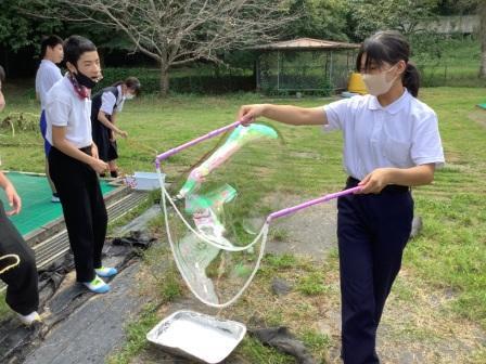 2年生は固形石鹸を削って計量し、3年生が作った袋に詰めました。