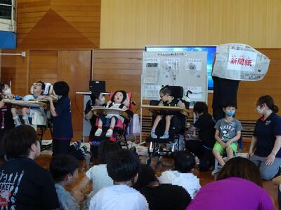 1年生は学級活動で縁日を自分たちで開催するための学習に取り組みました。6月から出店(射的、輪投げ)の準備を始め、出店計画を立てたり、作り方や必要なものを調べたりして、役割分担をしながら進めてきました。7月10日にお祭りを開き、重複障がい学級の友達や教職員合わせて15人以上のお客さんに楽しんでもらうことができました。