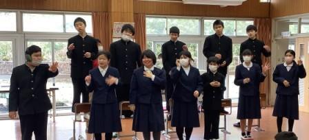 音楽では、1年生から3年生をたて割りの二つのグループに分け、歌詞を手話で表現し発表し合う学習に取り組みました。Aグループは『にじ』『さんぽ』を、Bグループでは『ビリーブ』を歌い、発表ました。