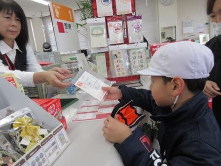 今月は、生活科で年賀状について学習をしています。1年生は学校近くの郵便局へ、年賀状を買いに行きました。一人で窓口で注文し、代金を支払い、年賀状とレシートを受け取ることができました。