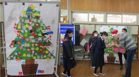 12月13日の英語では、イラストに色をぬったり、おり紙を折ってオーナメントを作ったりして、プレイルームの大きなツリーにみんなで飾りつけしました。クリスマスクイズで盛り上がったあと、サンタに扮したALTのアンドリュー先生から一人一人にプレゼントを手渡していただきました。