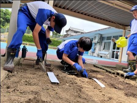 職業家庭科「職業体験」の学習で校内の環境整備に取り組みました。3年生は花壇に花の苗を植えました。苗の間隔40cmを測りながら、丁寧に作業ができました。成長が楽しみです!