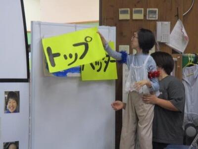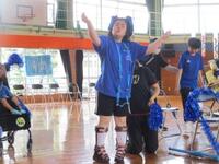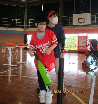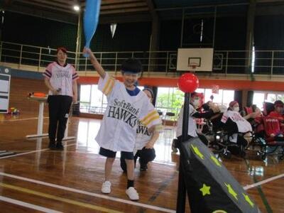 ダンス「やってみよう」ではWANIMAの曲に合わせてにぎやかに笑顔で踊りました。最後は布でできたバルーンをみんなで持って動かし、雰囲気を盛り上げました。応援合戦では赤団と青団のそれぞれがかけ声を掛けたり、運動会に向けて目標を書いた「TRY旗」を掲げたりして団結を示しました。競技「野球ARACYO盤」では、体育館を大きな野球盤ゲームに見立て、得点ゾーンを狙ってボールを打ち、チームの合計点を競いました。ボールを打つときには、補助具を使ったり、自分でバットを持ったり、得意な方法で取り組みました。