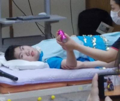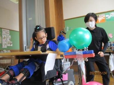 | ひもを引いたり高いところに手を伸ばしたり、補助具の釣竿を使ったりしてボールを集めました!! | |||
