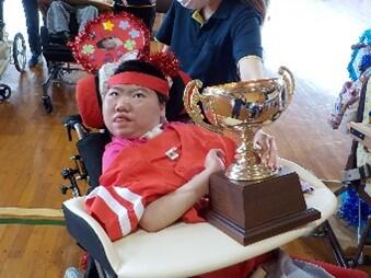 | それぞれの得意な動きを取り入れたり、看板や鳴り物をつくったりして応援合戦を盛り上げました! | 優勝のトロフィーをもらって感無量です♪ | ||