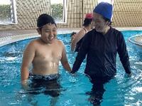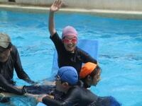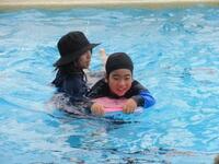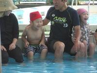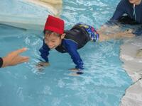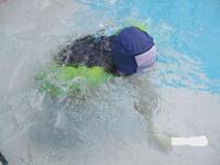 まずは水慣れから。冷たい水も平気だよ!早く遊びたいな。 ワニ歩きに挑戦!腕でしっかり支えて歩くことができました。 水に顔をつけるのも上手になりました。もう怖くないよ! 大プールではビート板を使ってバタ足にも取り組みました。