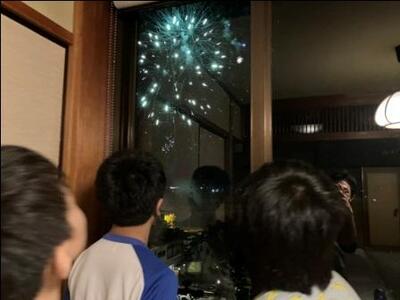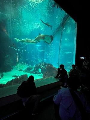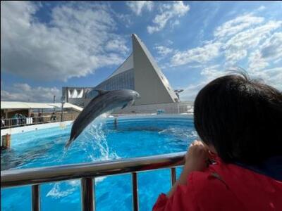 部屋に戻ってゆっくり一息。ホテルから打ち上げ花火も見ることができました。 2日目はマリンワールドへ。巨大水槽では、たくさんの生き物を見ることができました。 すぐ近くでイルカを見ることができました。豪快なジャンプに大興奮! お土産リストを見ながら商品を探しました。自分で代金を支払って買うことができました。