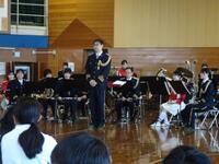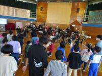 コンサートは、「ディズニーランドセレブレーション」の演奏でスタート。迫力ある演奏に最初はビックリした子ども達も次第に慣れてきて、体を揺らしたり手拍子をしたりと、盛り上がっていきました。リズミカルな曲ではみんな立ち上がって思い思いに踊って、楽しい気持ちを表現していました。カラーガードの演技では、その美しい演技に心奪われ、見入っていました。コンサートの途中では楽器の紹介があり、音楽の時間に学んだ楽器が出てくると、「フルート!」など、その楽器の名前を元気に答える子ども達。校歌も演奏していただき、子ども達は大きな声で元気いっぱい歌っていました。アニメの曲や親しみやすい曲など、合計8曲を演奏していただきました。子ども達は振り返りの学習の中で、「また来てほしい」「あの歌が良かった!」と感想を発表し、感謝の気持ちを込めてお礼状を作成しました。