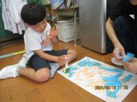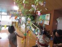 曲に合わせて、いろいろな楽器を演奏しました。 画用紙に塗った紙粘土に好きな色をぬって楽しみました。 暑い日のプールは最高!水の感触を存分に楽しみました。 笹に飾りや短冊を飾り付け。願い事が叶いますように!
