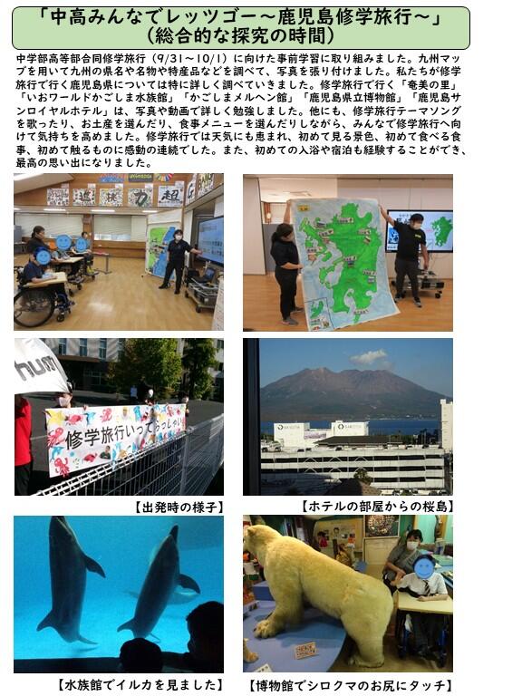 10月3日(木)・4日(金)の1泊2日の日程で、高等部2・3年生の3人の生徒と引率教師、保護者、看護師、総勢10人の修学旅行団は鹿児島市方面に出かけました。交通機関として、車椅子に乗ったまま乗降できるリフト付きバスを貸し切りで利用しました。